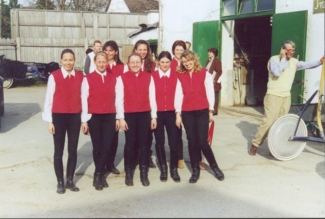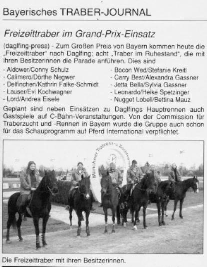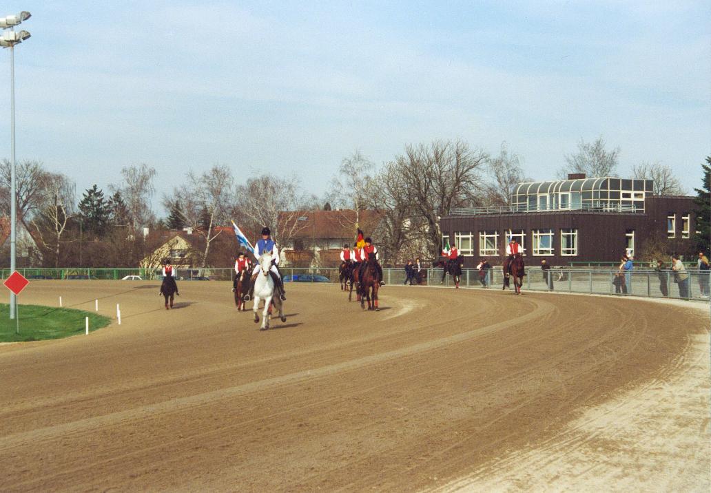 Hier in Daglfing war am 9.4.2000 unsere Premiere. Unser erstes Paradereiten. Eine Woche zuvor durften die Pferde und Reiter die Örtlichkeiten kennenlernen. Am Rand der Rennbahn war gerade ein Flohmarkt im Gange, so hatten wir sogar Publikum für unsere Generalprobe. Am Renntag lief dann alles wie am Schnürchen.